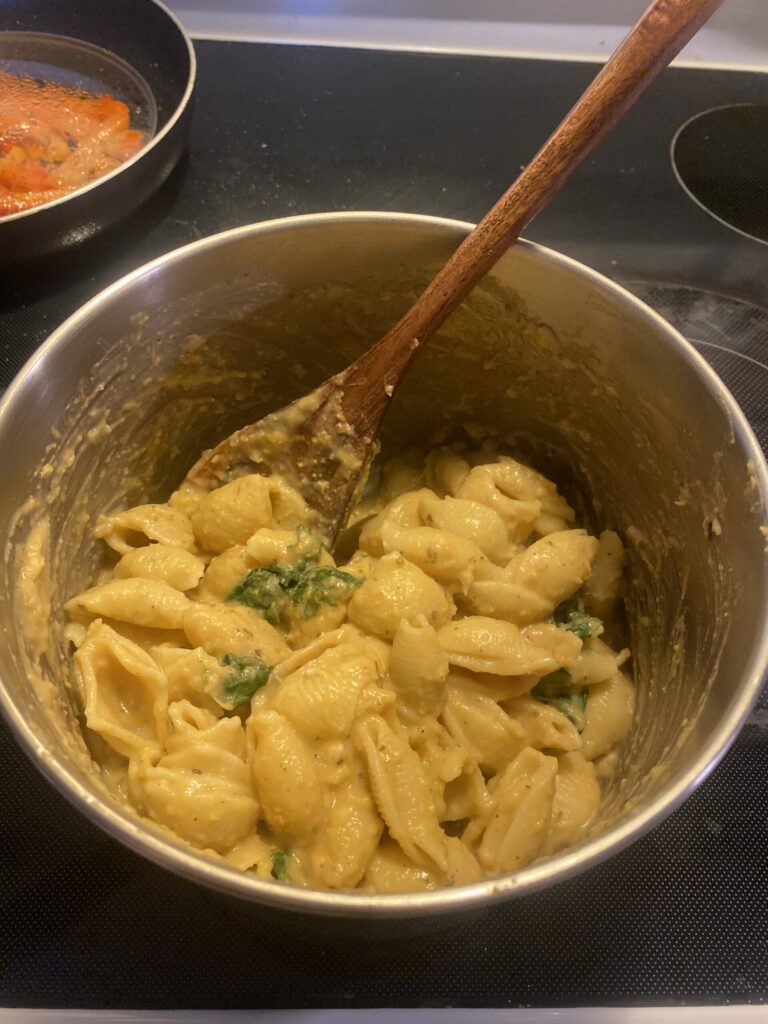 - For a white sauce, add lots of nutritional yeast, a splash of extra olive oil, and soy milk (if you have it) first. Stir until combined, then add seasoning.