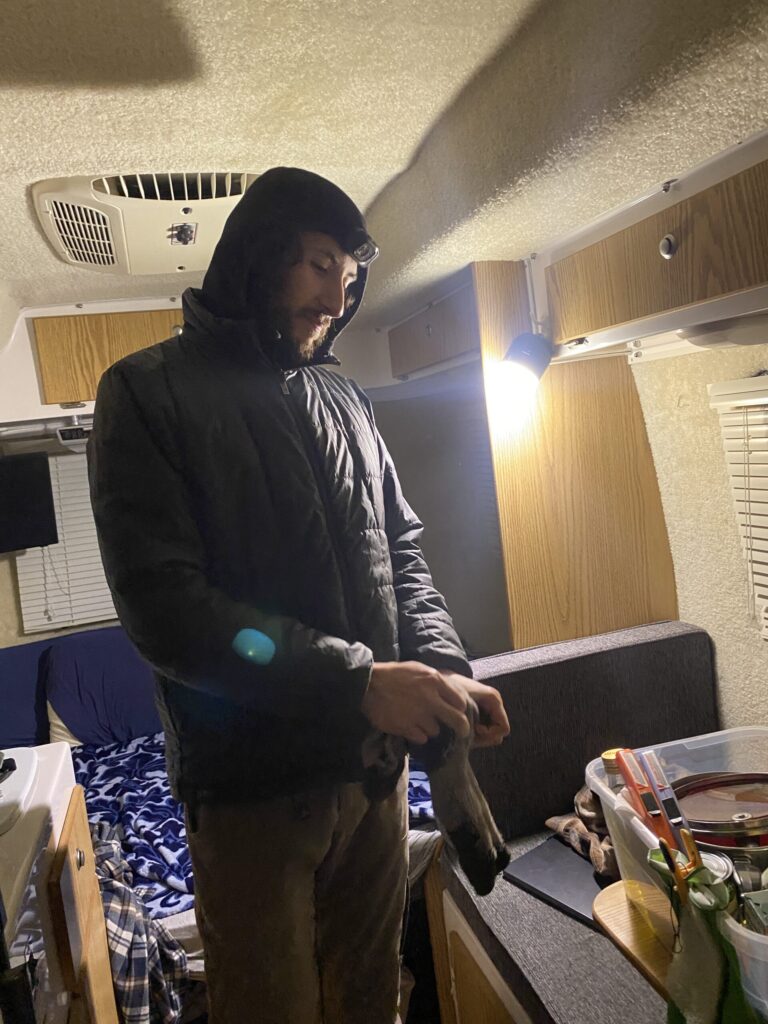My partner Tomo putting on warm socks to go cook outside on a chilly fall evening