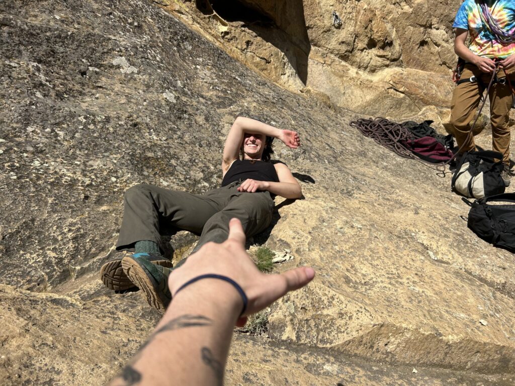 My friend Charlie pointing at me and my sandals (for unknowable reasons) before we commenced a multi-pitch out in Smith Rock