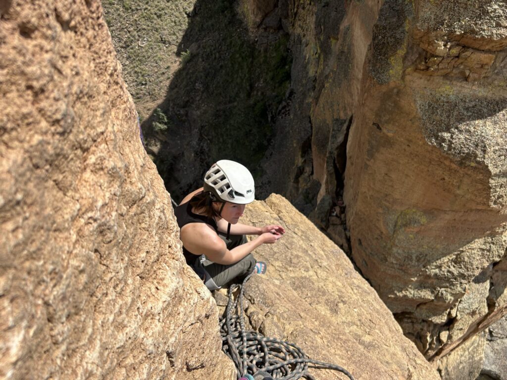 Me hanging out in sandals between pitches on Pioneer Route