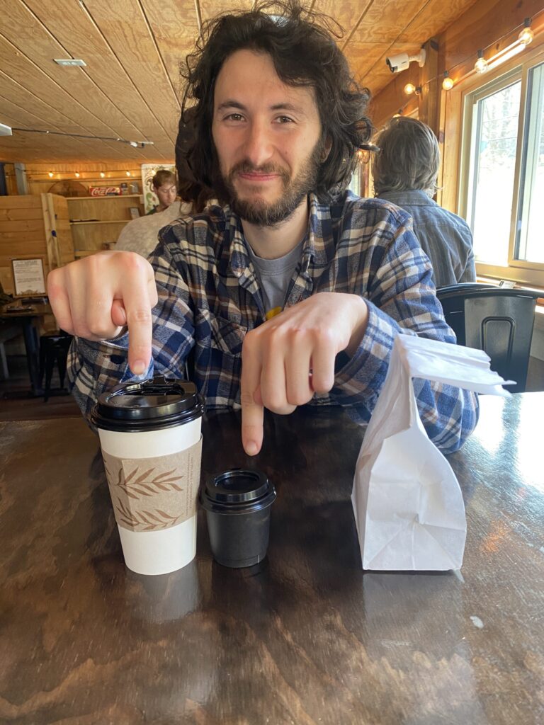 Tomo with my cortado (and a medium latte for scale)