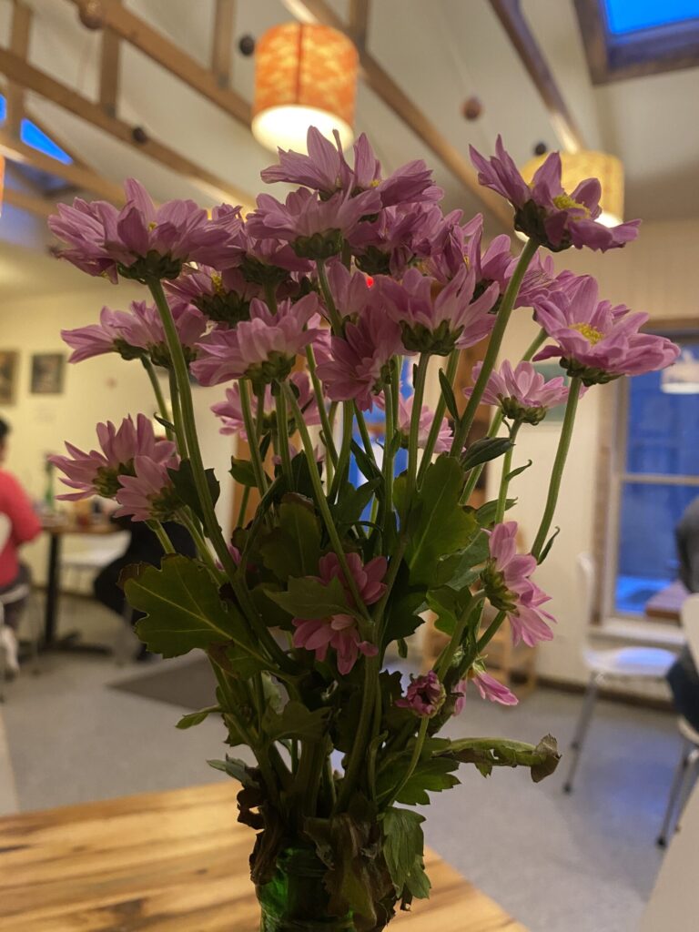 The interior seating is cozy and welcoming, accented by warm string lights, exposed wood, and local paintings and photography. If you venture to the back of the main seating room, you’ll find a doorway to an airy but homey sunroom with high-top tables and deep booths. I wrote a big chunk of my creative writing senior thesis right in this room. It’s also the cover photo of this article. If you want to explore further, a little door in the back left corner leads to a breezy outdoor patio with inviting picnic tables.