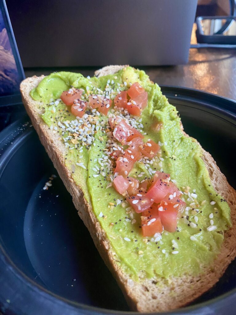 A classic DBCS avocado toast with fresh tomatoes and everything seasoning (you can also get crunchy onions on this dish)