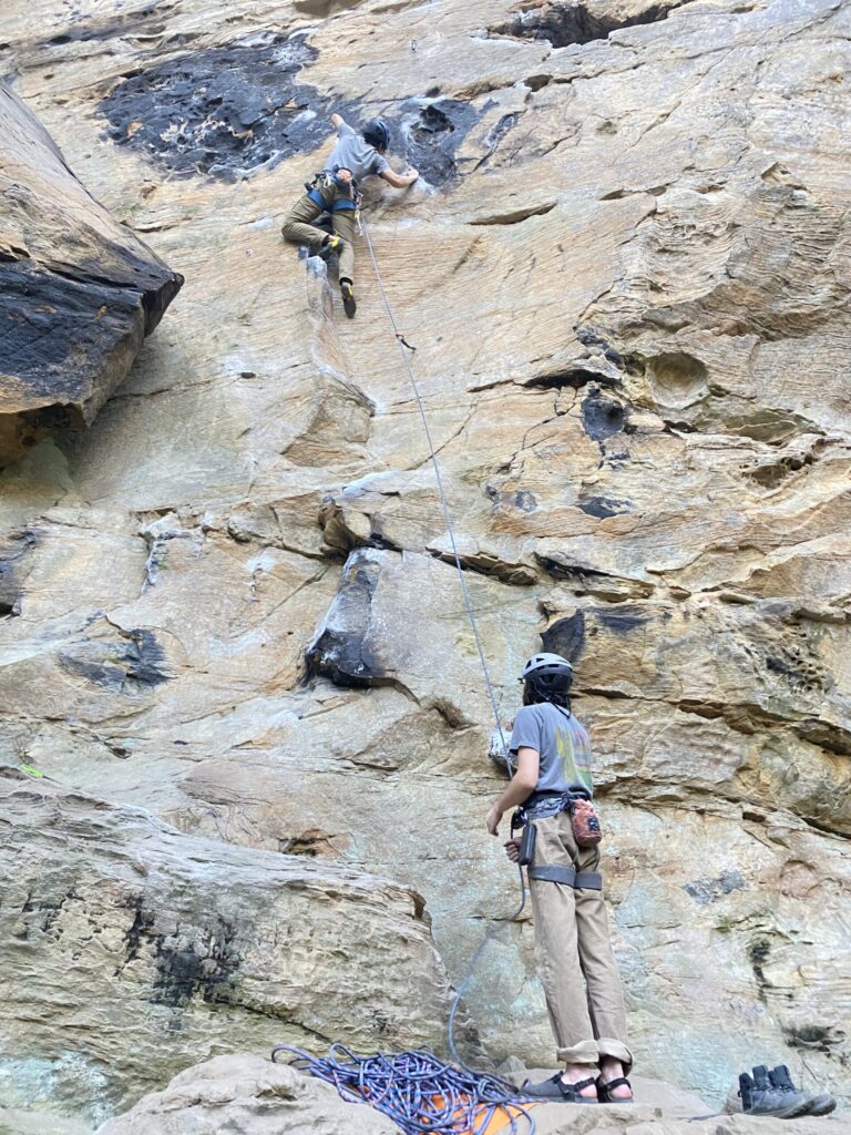 Max (climber) and Tomo (belayer) enjoying fall sending weather on The Preacher’s Daughter (11a/b)